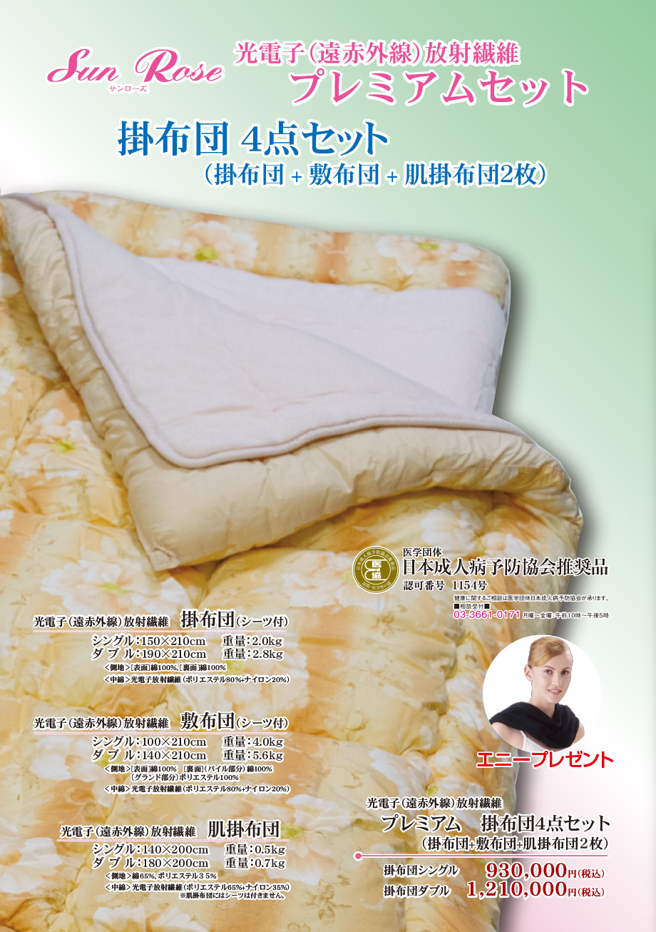 サンローズの肌掛け布団は、光電子(遠赤外線)放射繊維を織り込むことで、遠赤外線パワーを備えました。