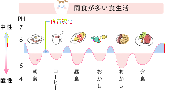頻繁な間食は、口内を酸性に傾け、むし歯菌などが繁殖しやすい状態をつくります。